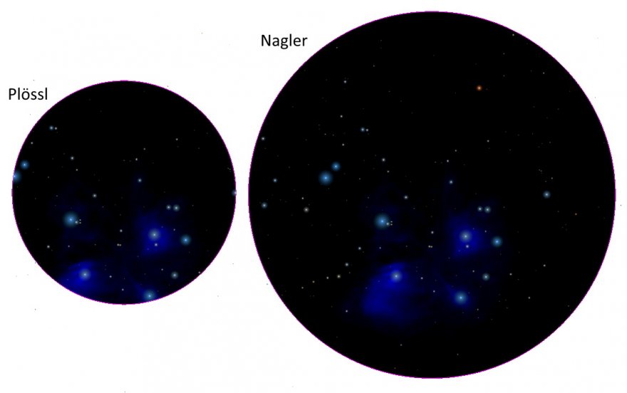 In parole povere, maggiore è il campo apparente dell'oculare (a parità di focale) e maggiore sarà il campo inquadrato, ad esempio col tuo (futuro) strumento se prendi due oculari da 17 mm di focale, il primo uno schema plössl (con 50° di campo apparente) e il secondo uno schema nagler (con 82° di campo apparente), entrambi ti daranno 41 ingrandimenti sul tuo strumento, ma il primo darà un campo reale di poco più di 1,2° mentre il secondo quasi 2° ed è riassunto nell'immagine, ho usato le Pleiadi, come vedi l'ingrandimento è identico mentre il campo (l'immersione nella scena è completamente diverso).