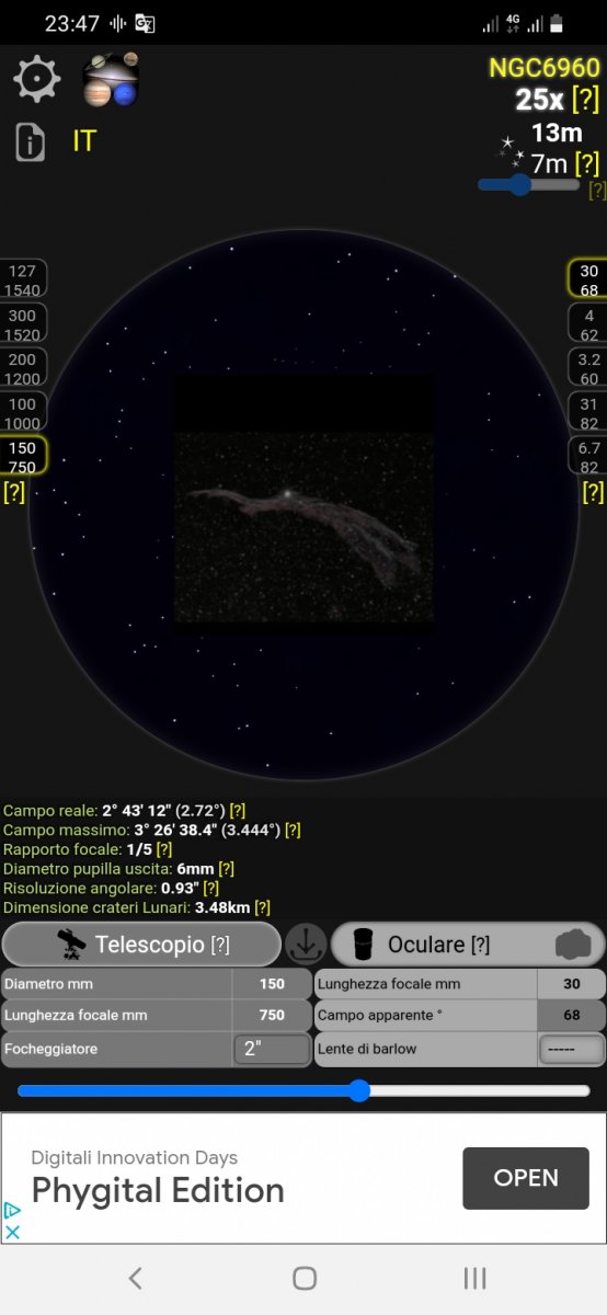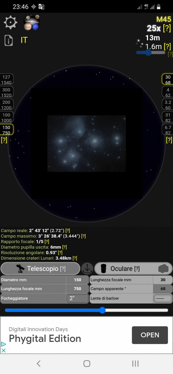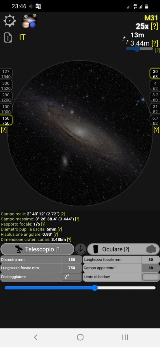 Questo era finalizzato a evidenziare il fattore relativo dell'ingrandimento; non è l'ingrandimento a essere determinante, ma il preciso allineamento fra il telescopio e il cannocchiale cercatore, il Telrad, o anche il semplice red dot. Se questo aspetto è particolarmente curato, l'oggetto centrato nel puntatore (chiamiamolo così per generalizzare) cadrà nel campo visivo dell'oculare da 68-70º a 187x (oculare da 4mm o 8mm più Barlow 2x, per il tuo telescopio) e perfino a 300x (oculare da 2,5mm o 5mm più Barlow 2x).