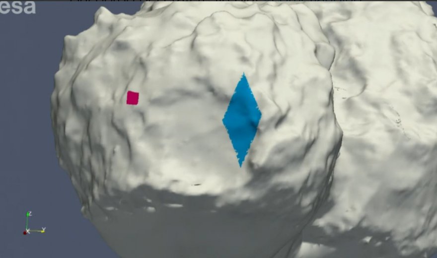 Pare dunque abbia fatto due salti, il primo dal punto rosso alla zona blu, raggiungendo una altezza fino a circa 1 km dalla cometa, con una velocità di 30 cm/s e per la durata di 2 ore, spostandosi così per circa 1 km...mentre un secondo salto molto piu' piccolo, durato 7 minuti a 3 cm/s, che lo ha portato ad agganciarsi dove è attualmente.