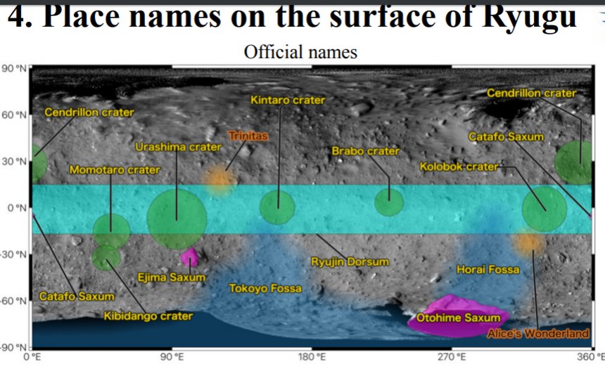 ecco i nomi ufficiali e ufficiosi delle principali strutture sulla superficie di Ryugu decisi dall'Unione Astronomica Internzazionale,