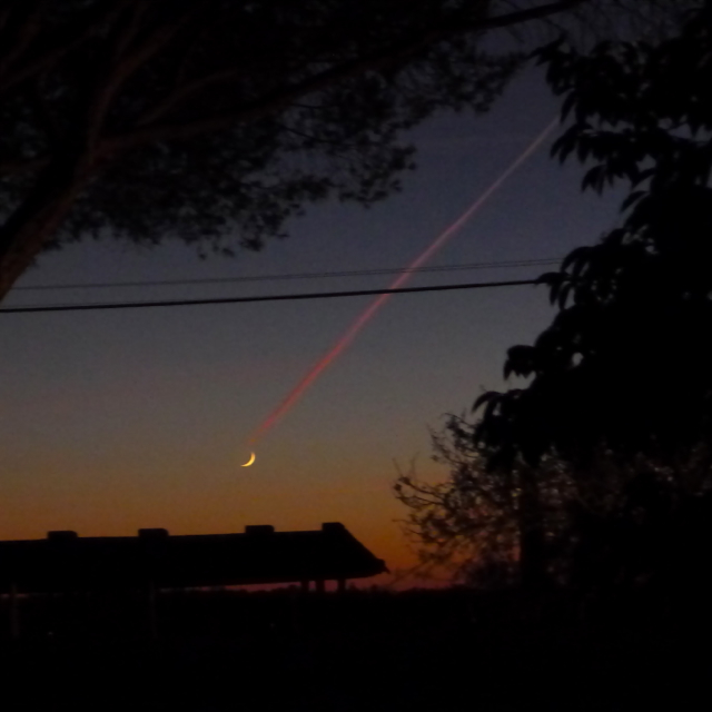 Visto che si parla di tramonti, uno con una scia chimica :biggrin: che quasi trafigge la Luna.
