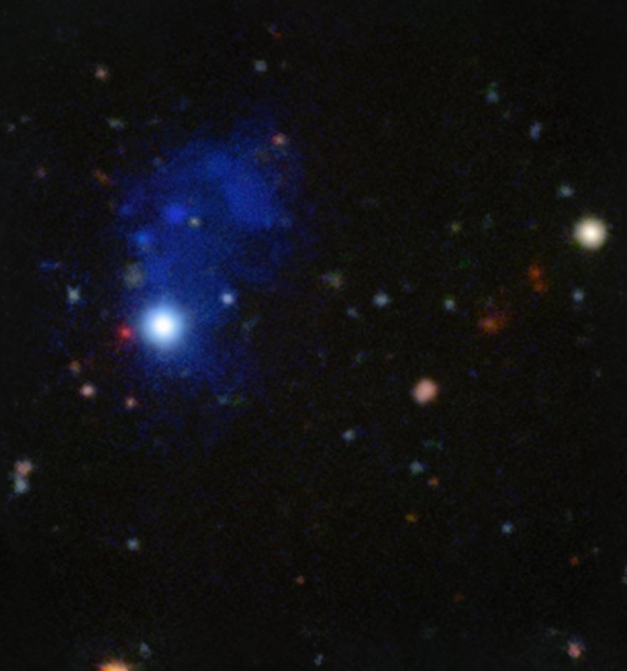 Questa foto della settimana mostra un’enorme nube di gas attorno al distante quasar SDSS J102009.99+104002.7, ripreso dallo strumento MUSE (Multi Unit Spectroscopic Explorer) sul telescopio VLT (Very Large Telescope) di ESO all’osservatorio Paranal. I Quasar sono i centri luminosi di galassie attive, essi sono mantenuti attivi dalla caduta di materiale nel buco nero centrale supermassiccio. Questo quasar e la nube nei suoi dintorni si trovano ad un redshift maggiore di 3, il che significa che sono visti come erano circa 2 miliardi di anni dopo il Big Bang. La nube di gas (o nebulosa) che circonda il quasar è conosciuta agli astronomi come ELAN (“Enormous Lyman-Alpha Nebula”). Questi tipi di nebulosa sono strutture massicce di gas formate nell’universo primordiale, esse possono aiutare gli astronomi a capire come il momento angolare - che spiega la rotazione osservata delle galassie più recenti - sia stato creato nell’universo. Grazie allo strumento rivoluzionario MUSE è ora possibile osservare queste rare nubi di gas in modo più dettagliato di prima.