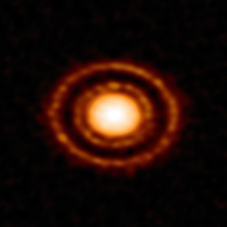 La lacuna esterna è profonda, larga e in gran parte senza polvere, il che suggerisce agli astronomi che un pianeta gigante di quasi la massa di Saturno stia orbitando qui - a circa 800 minuti-luce dalla stella centrale e più di tre volte la distanza tra Nettuno e il Sole! Mentre il pianeta ritaglia il suo cammino, la polvere si accumula al bordo esterno della sua orbita, creando anelli ben definiti nel disco. La lacuna nella polvere più sottile e interna potrebbe essere stata formata da un pianeta più piccolo, ma gli astronomi hanno suggerito l’intrigante possibilità che il pianete grande e distante avrebbe in effetti creato entrambi i cammini.