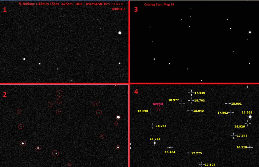 Riassumo in questa successiva immagine composita il risultato di questo test, nella quale ho ristretto il campo di interesse ad una zona intorno alla prevista posizione del satellite Nereide.