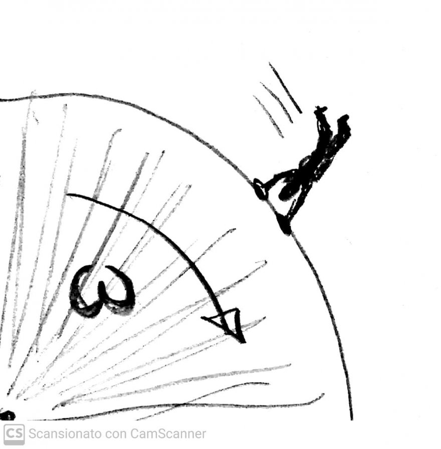 2) stava sulla pedana inizialmente ferma e lui invece di starsene al centro è andato ai bordi; cosa stupida perché la pedana ha accelerato, e ha impartito una accelerazione anche sull'uomo, con uno stratagemma malefico, ovvero l'attrito sotto le sue scarpe, che agiva in modo tangenziale; ma chissà perché, anche se l'attrito era tangenziale, e ne sentiva la pressione dentro le sue scarpe, sembrava che il risultato fosse una crescita di una misteriosa forza radiale (azione passiva, centrifuga).