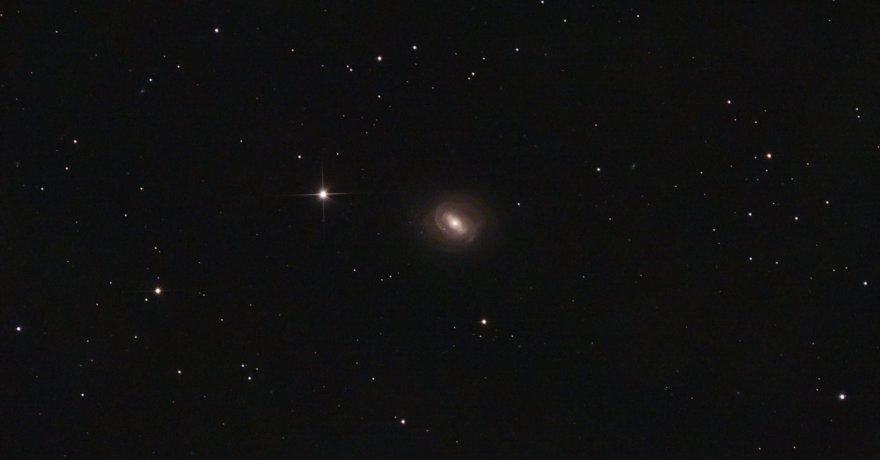 Ad esempio l'IL non è omogeneo, tantomeno per canali. Anche per sensori di piccole dimensioni che riprendono un piccola parte di cielo. Allego un singolo light stiracchiato e con la calibrazione dei colori delle galassie del Leone per dare una idea. Questo accade dalla mia postazione di ripresa. Premetto che ho utilizzato un filtro molto selettivo e poco adatto alla galassia, ossia un UHC-L baader. Simile ad un dual band.