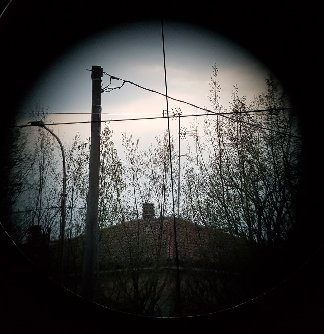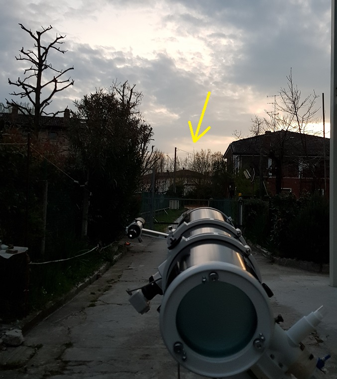 Fatto qualche prova sul calar del sole, cielo nuvoloso e nemmeno un pianetino piccino piccino. Luna nemmeno a parlarne, allora ho preso un albero a un centinaio di metri ed una antenna TV idem.