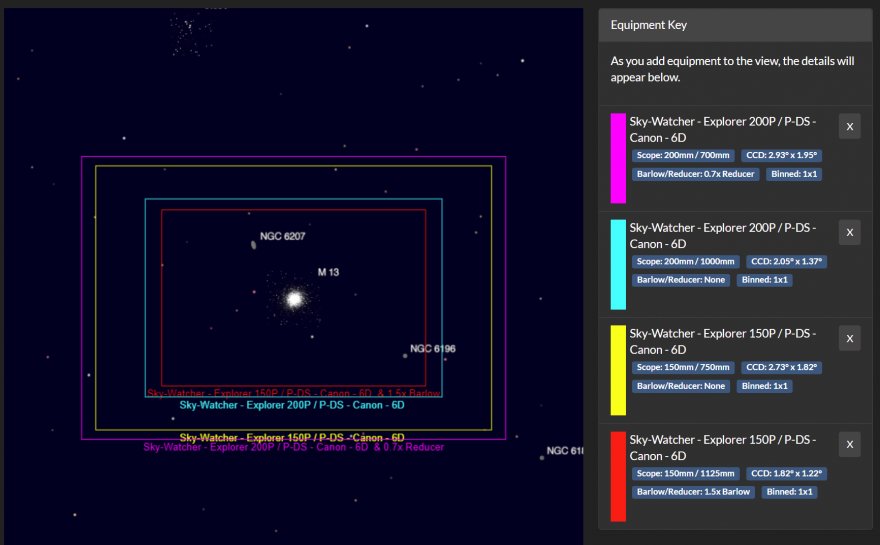 Nell'immagine potete vedere la comparazione tra un 150/750 (con e senza barlow 1,5x) e di un 200/1000 (con e senza riduttore 0,7x).