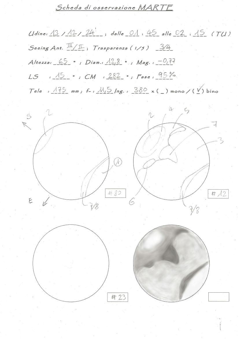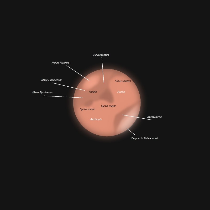 Da sud-est, senza soluzione di continuità verso sud-ovest, ho annotato e stimato di intensità 5 le zone di: Mare Tyrennhum, Iapigia ed Hellespontus, a corona di queste zone, leggermente più scure si evidenziano la Syrtis Minor ( piccolina ed allungata, int.6 ), la Syrtis Major ( solita forma a continente sud americano, int.7 ) e Sinus Sabeus che a forma di “virgola” chiude verso la zona equatoriale ( int.6 ).