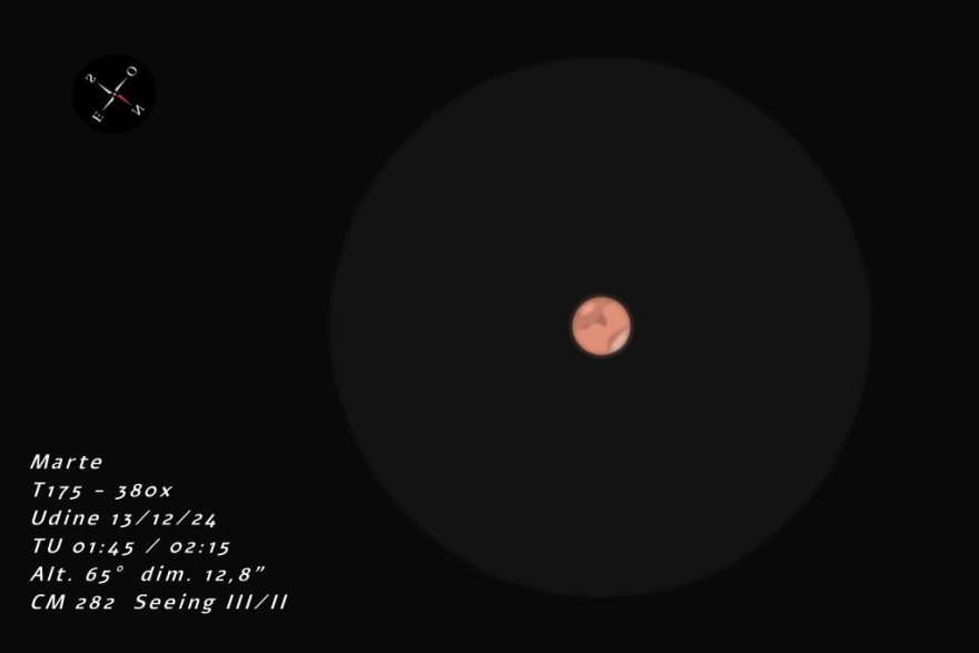 Certo che Marte si è "ingrossato" parecchio rispetto alla mia ultima “visita” ( 12,8” ), é passato anche a magnitudinene negativa ( mv – 0,77 ) mentre la fase al 5% lo rende alla vista quasi perfettamente sferico, finalmente inizia a mostrare un colore più arancione di prima anche se ancora un po' spento.