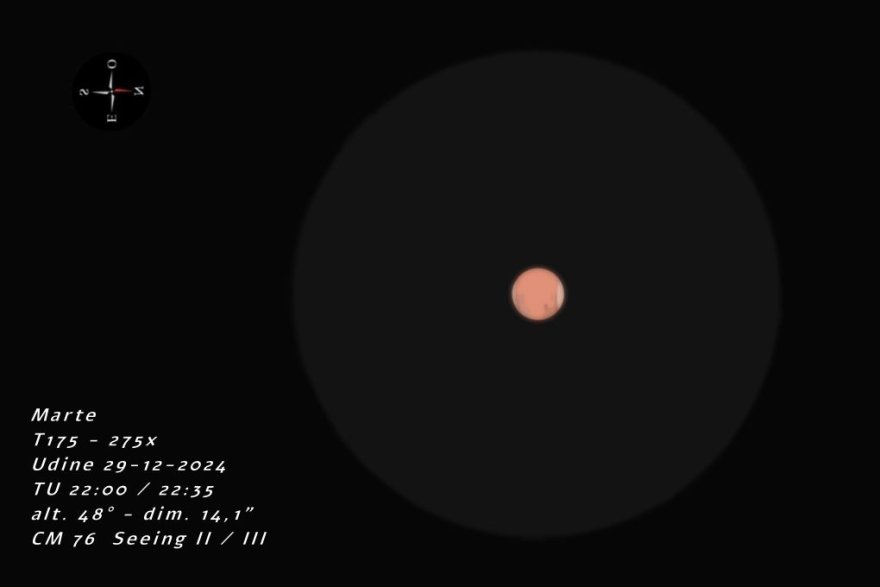 Siamo in prossimità dell'opposizione e Marte sta per raggiungere la massima grandezza, adesso sottende 14,1 secondi d'arco e brilla a mv -1,15, la fase é al 2% ed appare colorato di un arancione sbiadito.