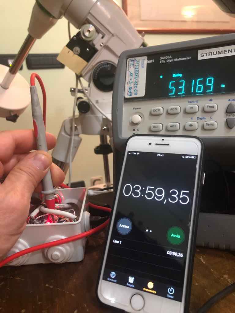 Per il Tracking si muove solo AR, ed il calcolo sello STEP_DELAY è quanto serve proprio per far avanzare di un microstep alla giusta frequenza. Arduino ha un oscillatore ceramico non precisissimo, il test che hai fatto tu indica un errore di circa l'1% - mi sembrava che l'errore fosse un po' meno: in ogni caso quanto hai fatto direi che corregge l'errore, anzi... se lo facessi più a valle arriveresti anche a correggere l'errore periodico. Correzione che vorrei implementare via software prima o poi (non mi sembra troppo complesso), o che comunque penso diventi superflua con l'autoguida - perché è chiaro che la differenza che hai trovato in visuale non ha alcun impatto. Sarebbe interessante calcolare che impatto ha in fotografia. Il tuo test l'hai fatto togliendo la cinghia? (quindi può essere influenzato dal resto della montatura?)