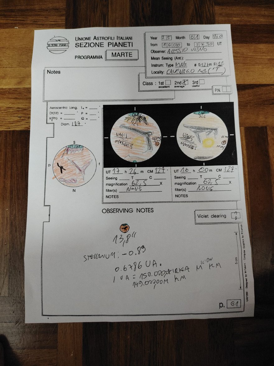 Allego ultima osservazione astronomica di Marte con visione della Ice Cap nord e di un ramificazione violacea rendente al marroncino. Allego scheda UAI. Allegato 54686