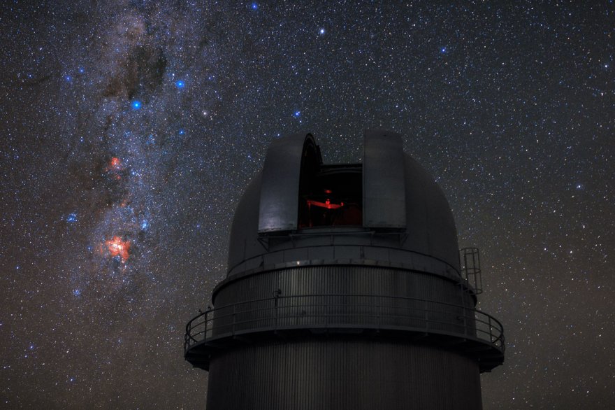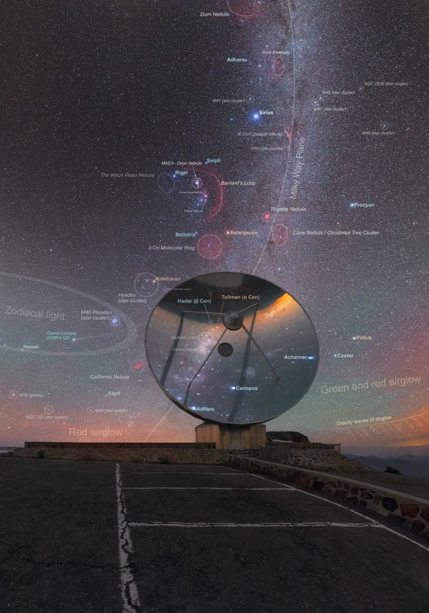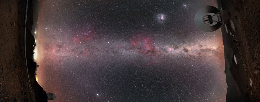 La maestosa fascia della galassia Via Lattea sfiora il cielo, creando un ponte cosmico tra due dei telescopi residenti di La Silla: il telescopio ESO da 3,6 metri (a sinistra) e il telescopio submillimetrico ESO svedese (a destra). Le Grandi e Piccole Nubi di Magellano - una coppia di galassie vicine - vengono catturate insieme, sedute "sopra" il piano galattico nell'angolo in alto a destra dell'immagine. La brillante spruzzata di rosso al centro dell'inquadratura č la bellissima nebulosa di Gum e il punto particolarmente luminoso nella parte inferiore sinistra dell'immagine č il pianeta Giove.