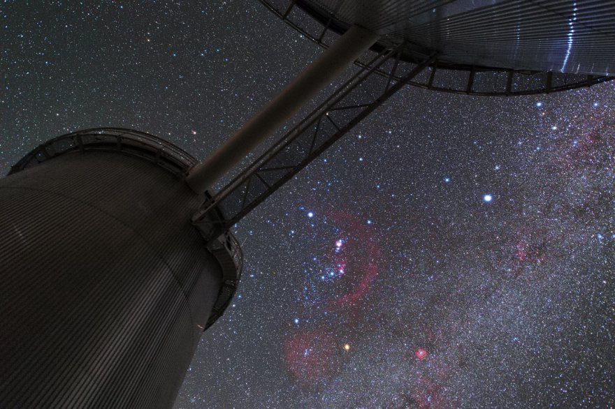 n questa spettacolare ripresa dal nord del Cile, la magnifica costellazione immediatamente riconoscibile di Orione (Il cacciatore) domina la piccola passerella che collega il telescopio di 3,6 metri dell'ESO al telescopio ausiliario Coudé (ora in disuso), entrambi situati all’osservatorio di La Silla dell'ESO.