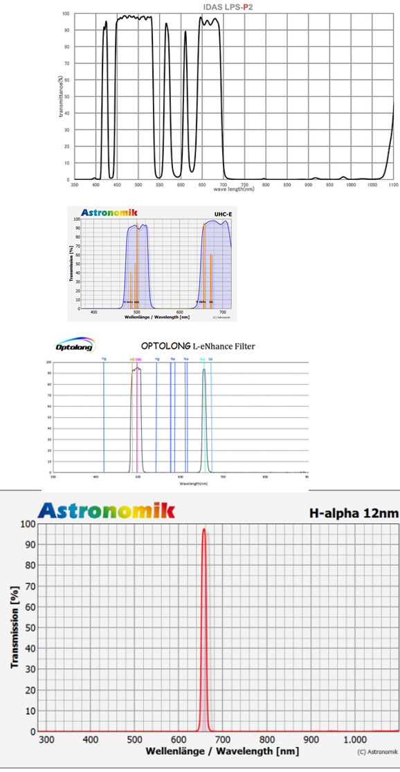 Al momento ho 4 filtri che uso per le foto: IDAS LPS P2, Astronomik UHC-E, Otpolong L-EnHancer e Astronomik H-Alpha (da 12 e 6nm). Qui di seguito ho comparato le varie bande passanti prendendo per buoni i valori ufficiali, e l'aspetto interessante trovo che l'Optolong permetta di sfruttare delle "finestre" piuttosto selettive, nell'H-alpha non mi pare molto differente dal filtro Astronomik H-alpha da 12nm, permettendo (forse)di scattare senza grossi problemi anche in presenza di un po' di Luna e inquinamento luminoso evidente.Allegato 34652