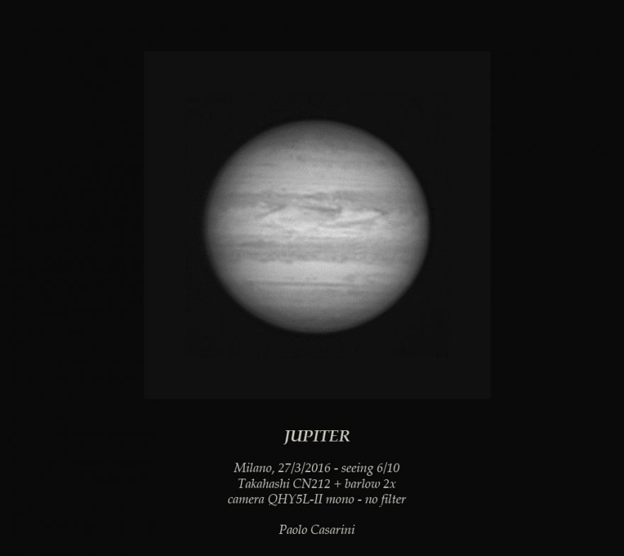 Parlare di spanne mi sembra decisamente eccessivo, diciamo che è un po più dettagliata, MA - non è RGB, che secondo me introdurrà un maggior allineamento fra le due perchè una derotazione e fusione perfetta è difficile da ottenere. L'immagine in B/n resterà sempre in B/n, e personalmente non la prendo in considerazione, non ci devo fare studi o chissà cosa, io guardo all'effetto apparente e Giove lo voglio vedere a colori.
