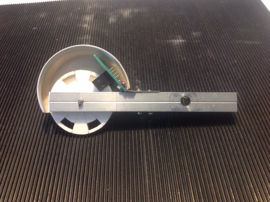 Con una stisciolina di metallo ho fissato il circuito con i due sensori Omron e con un tappo Bormioli ho costruito anche un cater per schermarli dalla luce. Una molla terrà il tutto premuto contro il bordo mobile della cupola. Allego qualche foto.Allegato 35941Allegato 35939Allegato 35940