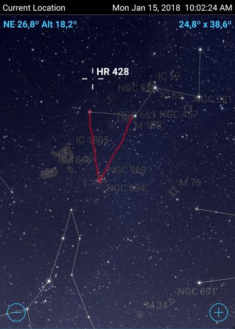 Prova anche cosi. Triangolo isoscele immaginario con alla base le due stelle piu' a sud di Cassiopea. Sul vertice trovi il doppio ammasso (che spesso si nota ad occhio nudo)