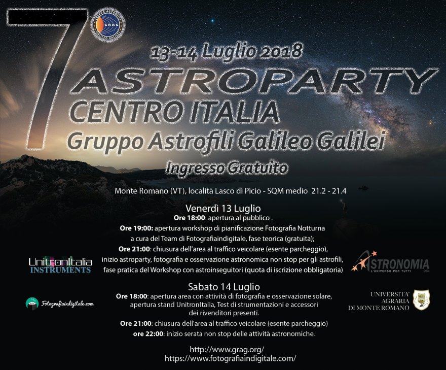 Il GrAG, Gruppo Astrofili Galileo Galilei di Tarquinia presenta il 7° raduno astronomico nazionale del Centro Italia che si svolgerà nelle date del 13/14 luglio 2018 a Monte Romano (VT) in località Lasco di Picio all’interno dell’area sociale.