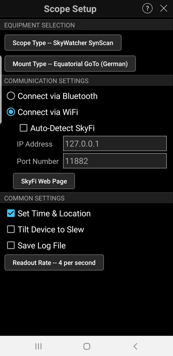 Ti faccio inoltre presente che il Modulo Wi-Fi SynScan non è riconosciuto dalla app SkySafari. Funziona solo con la app SynScan (liscia o PRO) nonostante Skywatcher ne pubblicizzi la compatibilità anche con SkySafari.