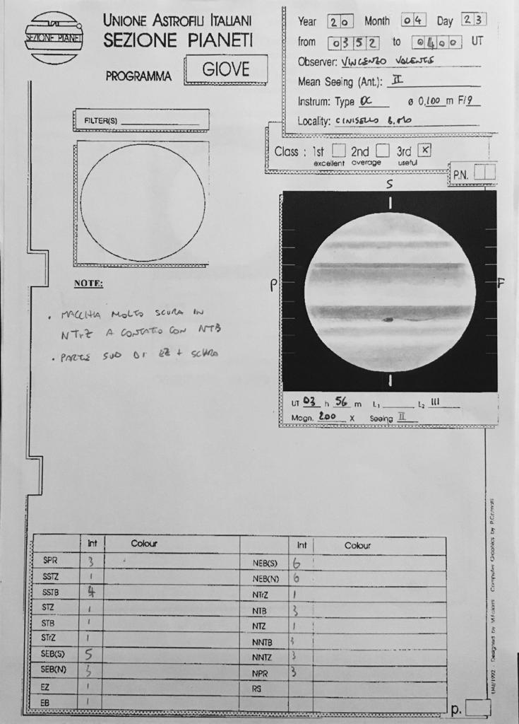 C'era una strana macchia scura proprio in meridiano tra la NTrZ e la NEB. Ho controllato, ma non erano né satelliti né le relative ombre. Dev'essere una formazione atmosferica, vedremo come evolverà.