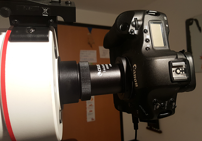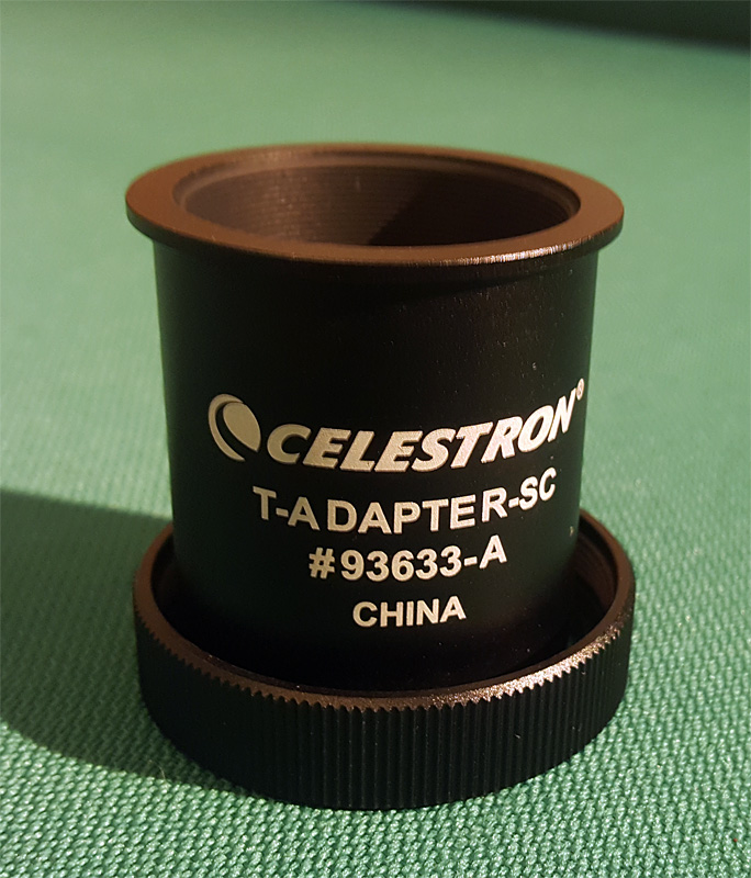Da una parte telescopio con filetto maschio SC (2") e visual back da 1.25" avvitato con ghiera, dall'altra reflex con anello Canon T2 e nasino che si infila nel visual back, fissato dalla solita vitina. La reflex è pesante e ne viene una cosa abbastanza lunga e precaria, specie quando il tubo è puntato verso l'alto e la reflex è trattenuta solo dalla piccola vite che stringe il naso nel visual back. Senza contare la strozzatura del raccordo da 1,25.