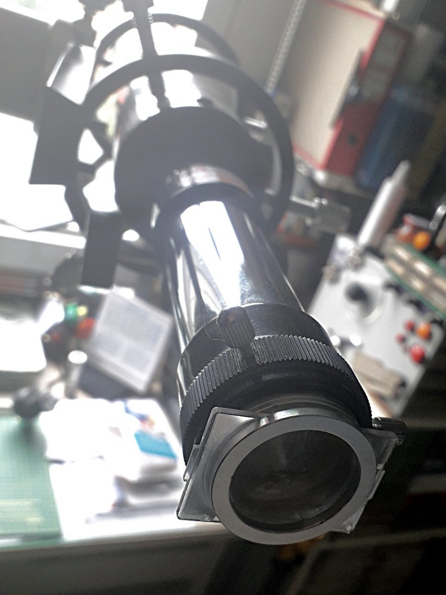 Per andare a fuoco con la reflex (rigorosamente a pellicola), all'epoca avevo segato 5 o 6 cm di tubo in modo da avvicinare il secondario al primario. Peccato poi che le dimensioni del secondario non fossero sufficientemente grandi.... lascia perdere.... goditelo in visuale e poi spenditi qualche mila euro per farti un'attrezzatura fotografica dignitosa