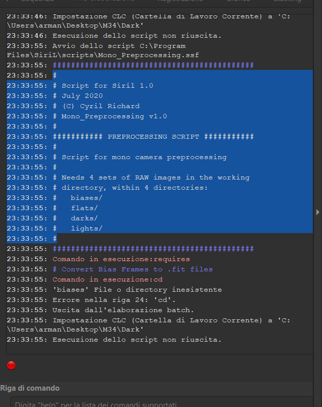 1 ho creato la cartella con i quattro file Bias, dark, flat e light, ho dato avvio allo script processing e subito mi è apparso Esecuzione dello script non riuscita. Cosa vuol dire? dove ho sbagliato ?