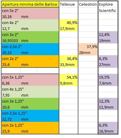 L'apertura minima per una 2x è 25,4mm (27mm ES, appena sopra il minimo),per una 2,5x è 20,3mm (28mm Celestron/Omegon abbondante sopra il minimo), e per una 3x è di 16,9mm (19mm ES appena sopra il minimo), da questo quella sovradimensionata è la Celestron/Omegon, mentre le ES sono appena sopra il minimo necessario.