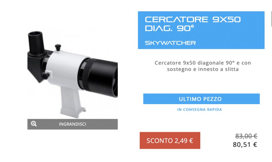 La mia difficoltà principale comunque è che non riesco a puntare oggetti allo zenit. Il cercatore è capovolto essendo parallelo al tubo quindi è scomodissimo da usare. Per questo mi chiedevo se si potesse usare l'oculare stesso come cercatore, ma mi rendo conto che il campo visivo è troppo piccolo. Poi credo che un altro problema siano gli ingrandimenti, con 30 ingrandimenti secondo me non riesco a distinguere la nebulosa, forse mi appare come una stella. Ovviamente usavo l'oculare da 25mm solo all'inizio, poi mettevo l'explore scientific dac4.7mm e 82°
