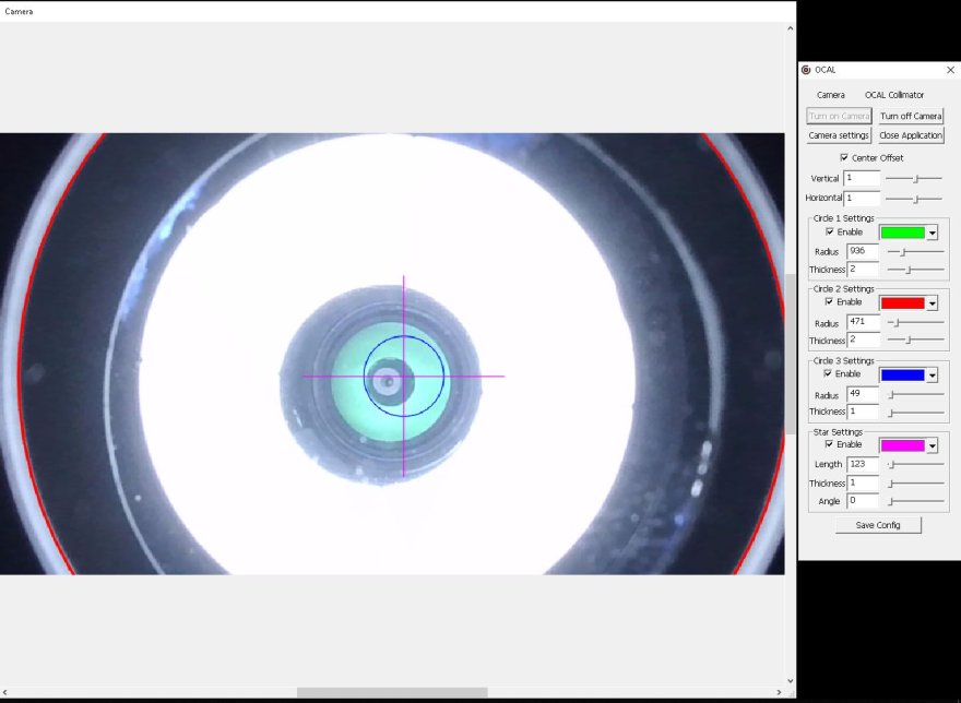 L'allineamento viene fatto attraverso il collimatore Ocal, il cerchio rosso dovrebbe essere il tubo del focheggiatore, mentre il cerchio blu con il crocicchio viola dovrebbe essere la centratura della telecamera che viene riflessa dallo specchio.Essendo centri concentrici dovrei riuscire a centrare la telecamera che si intravede nel cerchiolino grigio dello specchio primario.