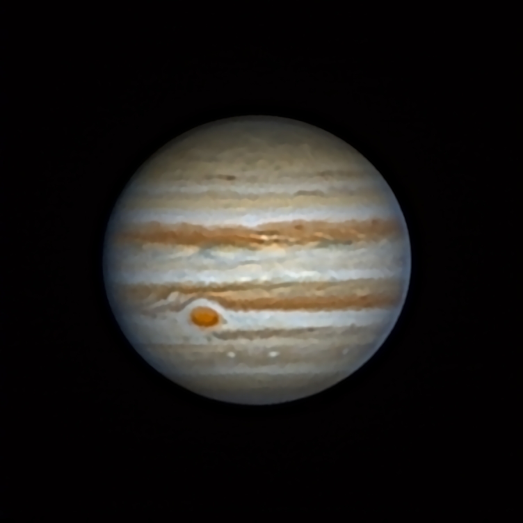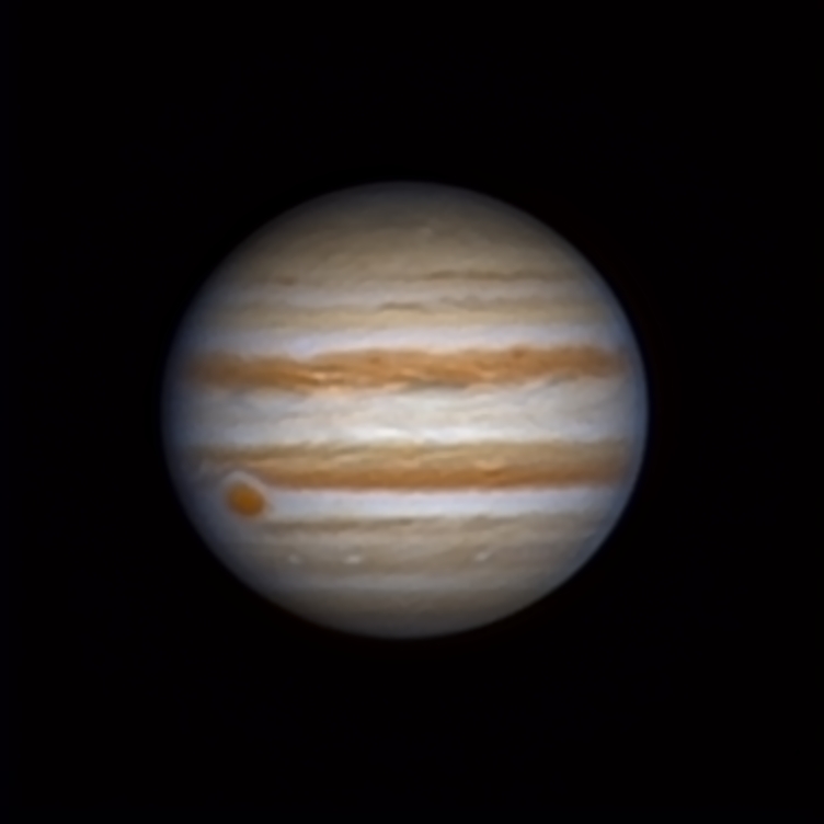 Dopo cena ho elaborato una delle riprese che sembrava potesse dare qualche soddisfazione, su Giove si nota la macchia rossa seguita da Europa. L'ombra del satellite è a sinistra, quasi a contatto con Europa. Purtroppo il satellite è quasi invisibile nell'immagine, si nota appena solo sapendo dove guardare. Speriamo in questi giorni di trovare un'atmosfera meno agitata.