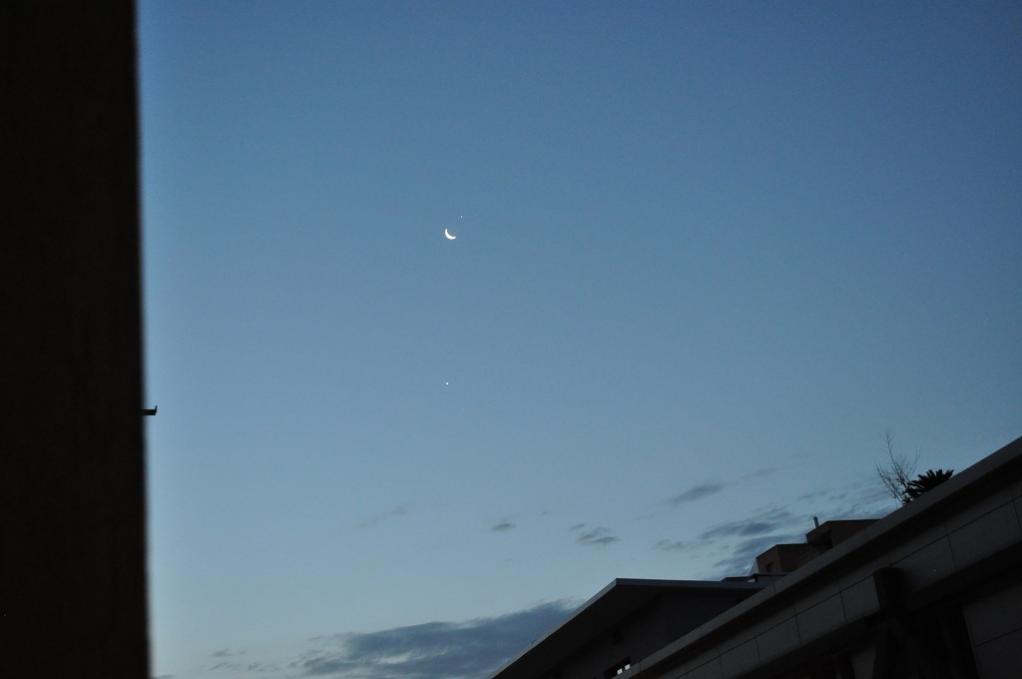 se pensate che la Luna sia piccola, ricordate che ho utilizzato un 300mm come teleobiettivo, fatto che consente di avere viceversa una Luna abbastanza grande sul "fotogramma" di ripresa: confrontate infatti la "grandezza" del disco lunare con quella nella foto che ho scattato di ritorno da casa, dal balconcino, con l'obiettivo normale (34mm di focale) ...
