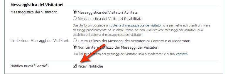 Ogni volta che un utente viene ringraziato, riceverà una notifica (come avviene per i messaggi privati). E' possibile abilitare/disabilitare la notifica dal proprio pannello di controllo, nelle Impostazioni Generali: