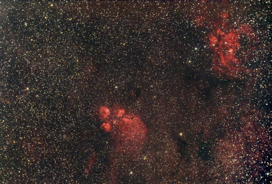 E invece nel sacco c'è finita anche la Nebulosa Aragosta ( NGC 6357 ). Ho voluto provare, almeno fino a che qualche sito dalle mie parti rimane accettabile per quanto riguarda l'inquinamento luminoso, a intraprendere questa sfida su un oggetto che dalle nostre latitudini rimane parecchio basso e difficilmente fotografabile. Appena il buio astronomico era totale ho provato a individuare questo oggetto ma all'inizio nell'inquadratura si vedevano ancora le cime degli alberi. Appena il frame è risultato pulito ho dato il via alla sequenza sperando che almeno in prossimità del meridiano l'altezza arrivasse dove il cielo era piu' nero.... Ma in effetti è rimasto sempre nella zona piu' chiara .... Ho continuato ad integrare con scatti relativamente brevi da cinque minuti collezionandone una ventina... Questo è il risultato a piena risoluzione: https://www.astrobin.com/full/413229/0/