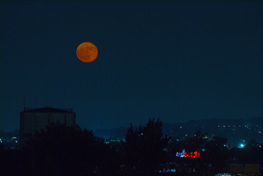 In questo periodo la Luna non sorge mai completamente dal bordo dell'odioso palazzo, ma sono riuscito per una botta di... fortuna a fotografarne uno spicchio che spuntava appena, per poi rituffarsi dietro.