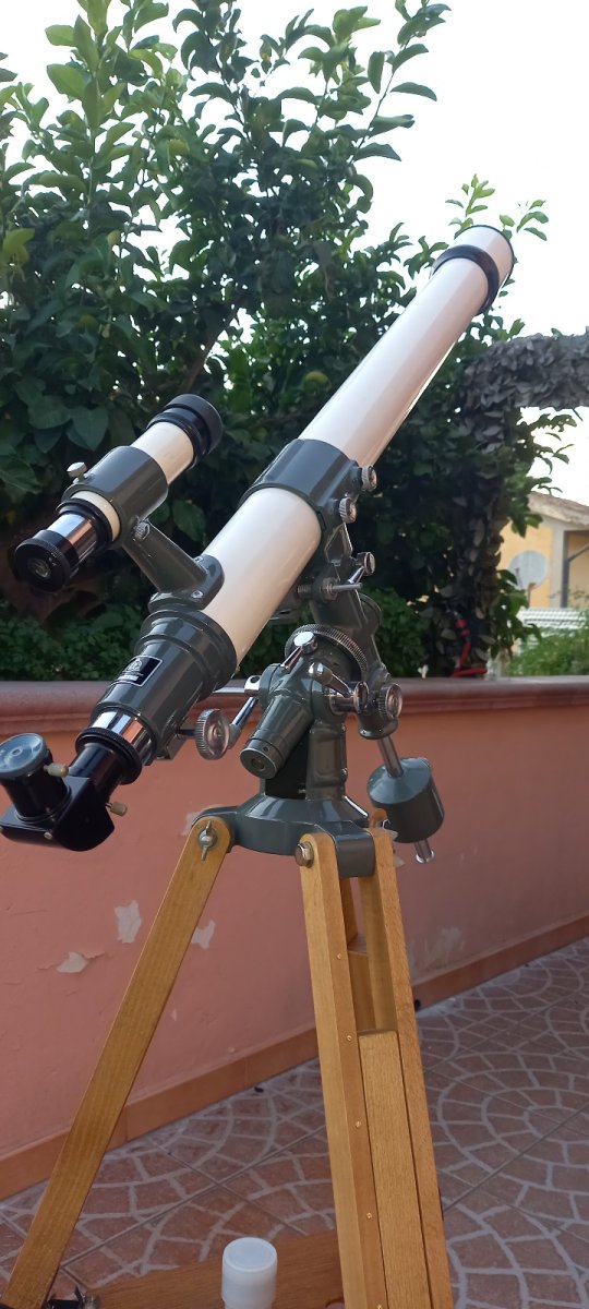 Ebbene si , mi piacciono i sessantini , ho comprato questo per pochi euro , si tratta di un 60 f900 costruito da Hino Optical Company , mi è arrivato nella sua bella scatola di legno con tutti i suoi accessori , gli unici lavori che ho dovuto fare per rimetterlo in piedi , sono stati una bella sgrassata e lucidata generale , il tubo da bianco era diventato marrone , fortuna che le ottiche erano state riposte in sacchetti di plastica e quindi i vetri sono rimasti puliti , altro lavoro che ho fatto è stato rifare le gambe del cavalletto , le vecchie erano tutte curvate e malconce , questo telescopio si presta bene ad accogliere oculari da 31,8 in quanto ha un tubo di messa a fuoco stile vixen con filetto metrico da 36x1 , ho quindi costruito un adattatore per poter montare gli oculari da 31,8 , mi sono documentato su questo telescopio leggendo discussioni su Cloudy Nights e sembra che sia stato costruito tra la fine degli anni 50 e i primi degli anni 60 , il produttore H.O.C sembra essere uno dei migliori dell'epoca .