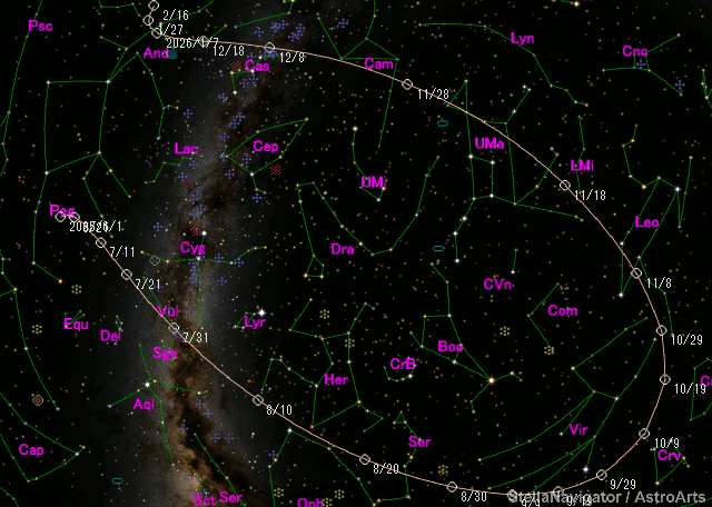 Nei mesi di agosto e settembre transiterà apparentemente tra la costellazione di Ercole e della Corona Boreale quindi visibile nella prima parte della notte.
