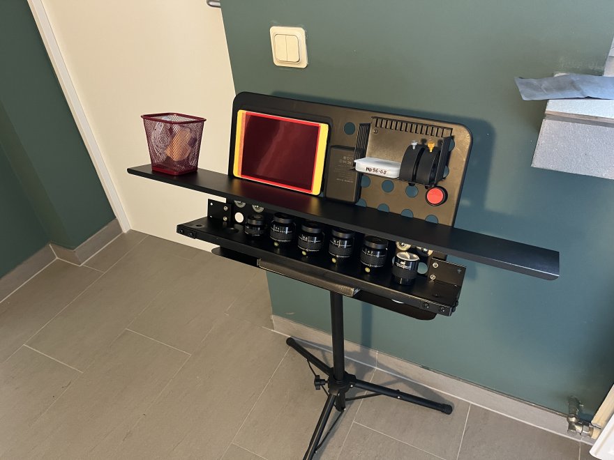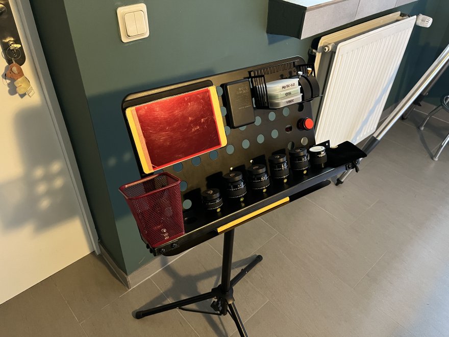 Ho pensato di aggiungere una tavoletta di legno 65x9x20mm acquistata da un magazzino di bricolage (circa 5 eur) e di ricavare buchi da 32mm di diametro con una lama circolare da trapano (circa 7 eur). Il tutto carteggiato e poi verniciato con bomboletta nera (6 eur) e fissato al leggio con delle staffe ad L di metallo (altri 3/4 eur).