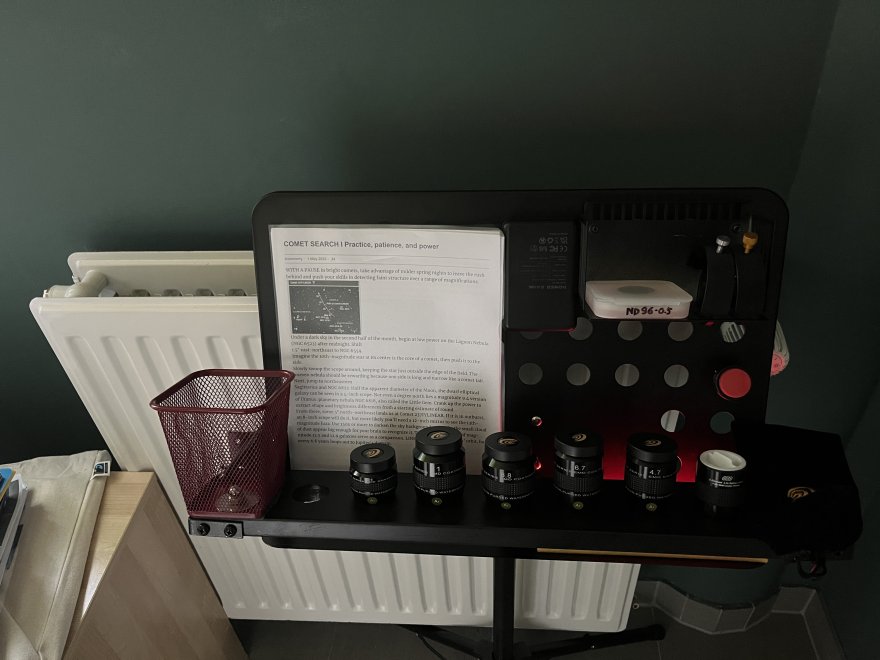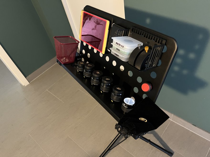 Questo setup mi consente di prendere il tutto con una mano ed uscire sul giardino tramite la porta bianca che vedete nella foto. Tutto molto veloce e comodo. Quando rientro, lascio gli oculari stappati per non creare condensa e la mattina dopo riapplico i tappi, conservati nel cestino a sinistra (un vecchio portapenne Ikea, riverniciato e fissato con una vite alla tavola di legno).