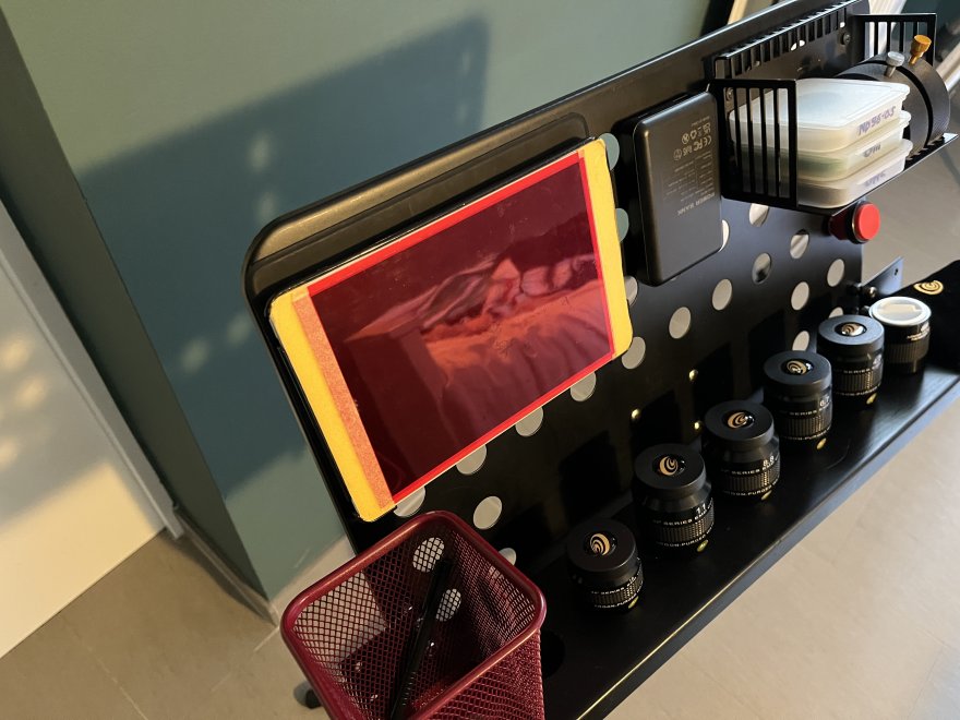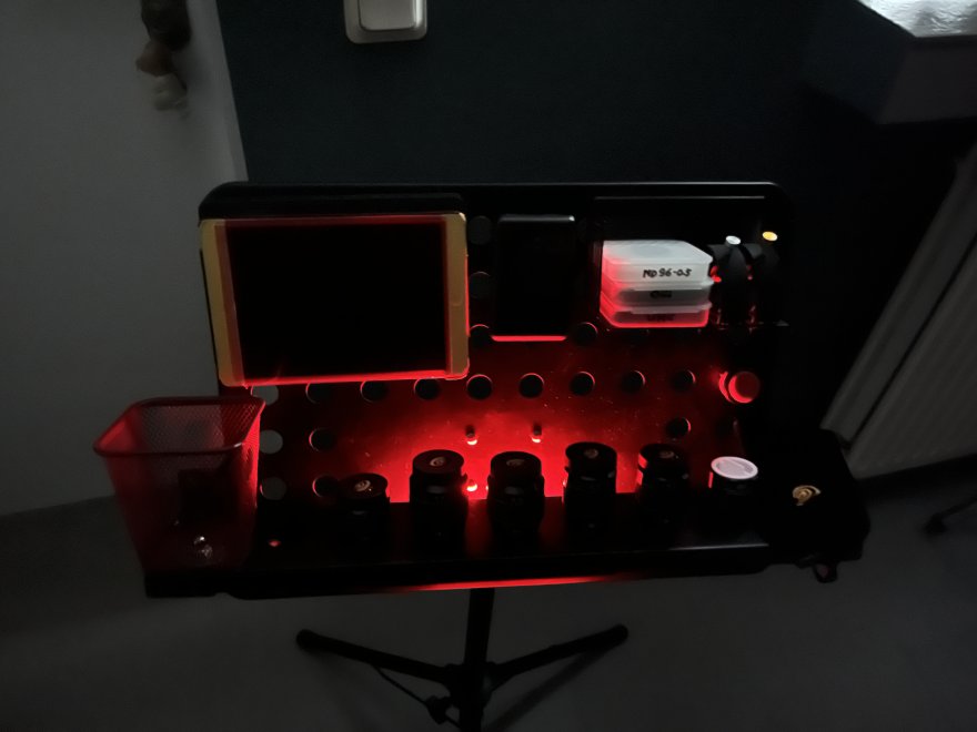 Sia la luce che che lo schermo del tablet (uno vecchio che ormai uso solo per Skysafari) sono coperti con 4 strati di filtro rosso per fotografia. Su Amazon vendono confezioni da 10 fogli A4 a qualche euro, facilmente ritagliabili con forbici o taglierino. L’effetto sul tablet è davvero ottimo per ridurre l’emissione di luce bianca dovuta alla retro illuminazione. Lo schermo rimane tattile e perfettamente manovrabile. Non sono autoadesivi, quindi li ho fissati con comune nastro adesivo.