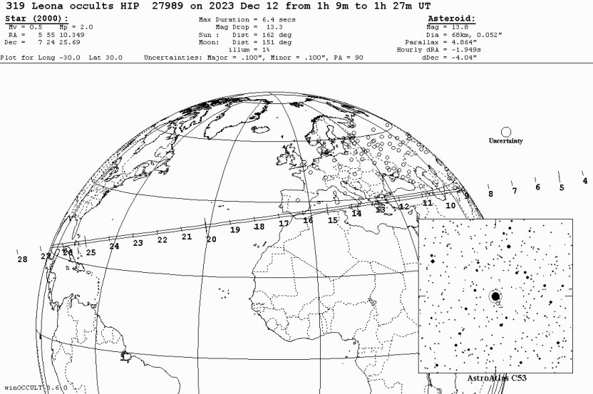 la prossima occultazione di una stella luminosissima da parte di un asteroide (segnatelo sul calendario!) avverrà il 12 dicembre 2023 quando l'asteroide 319 Leona occulterà nientemeno che Rigel (corretto: si tratta di Betelgeuse!!)(alfa Orionis) di magnitudine 0.5!!!